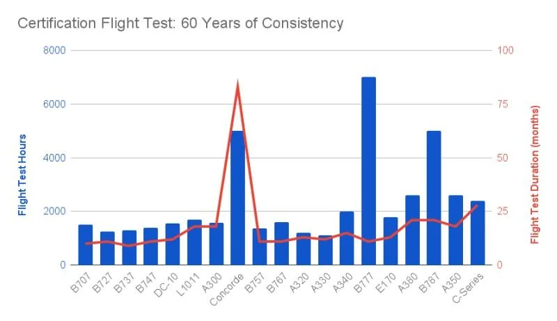 👉🏼 Once an aircraft actually makes it to flight test – the part often shown in the media – the process has been remarkably consistent despite more than 130 updates to the regulations since 1964.** Excluding Concorde, clean-sheet programs cluster around ~1,900 flight hours over ~15 months.***